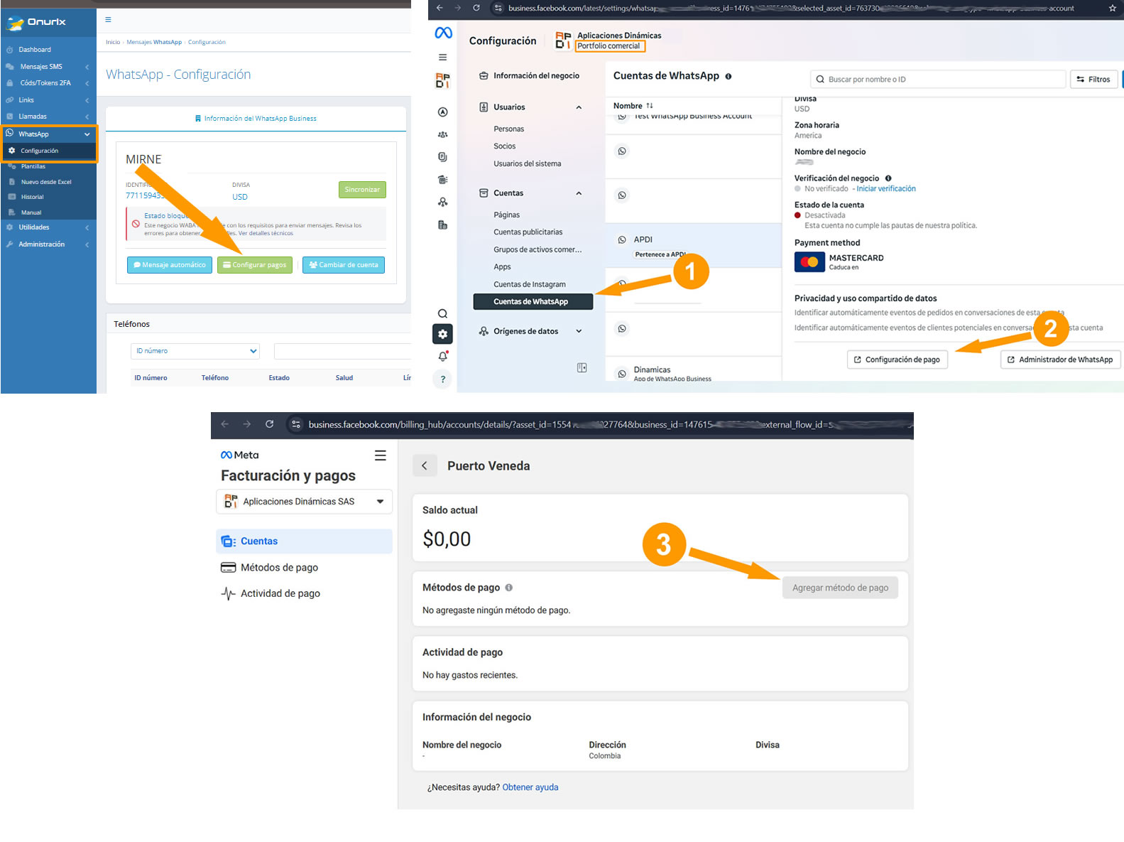 ✓ Agregar un método de pago válido en Facebook, para que Meta debite su fee por los mensajes enviados.
